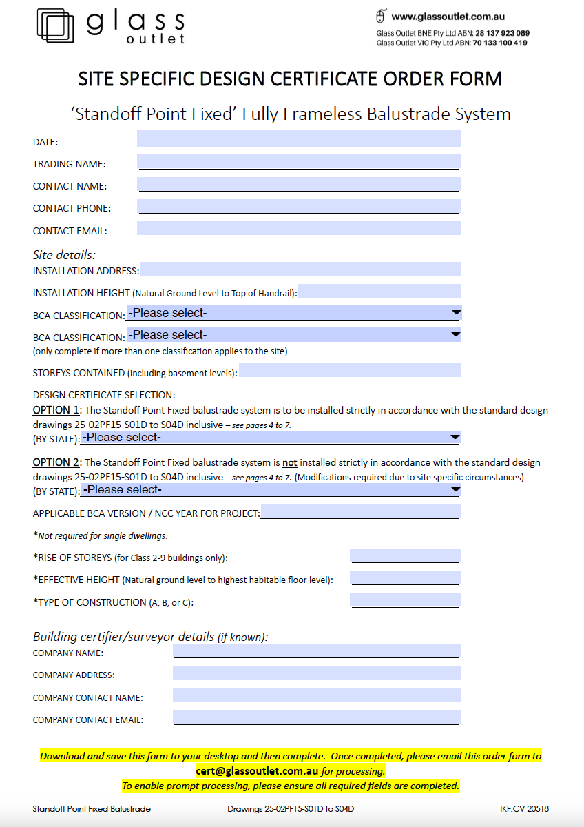 Depending on certification requirements of the installation location, a standard balustrade design document may be sufficient OR site specific certification may be required (eg Form 15 for QLD, Reg 126 for VIC etc).